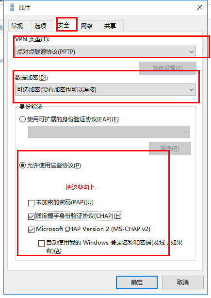 6、在VPN属性安全那里类型选择PPTP 允许使用这些协议打勾,可按照图片操作”