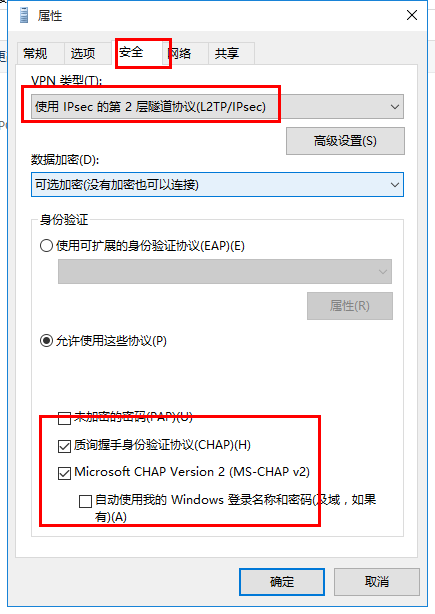 6、在VPN属性安全那里类型选择L2TP 允许使用这些协议打勾,可按照图片操作