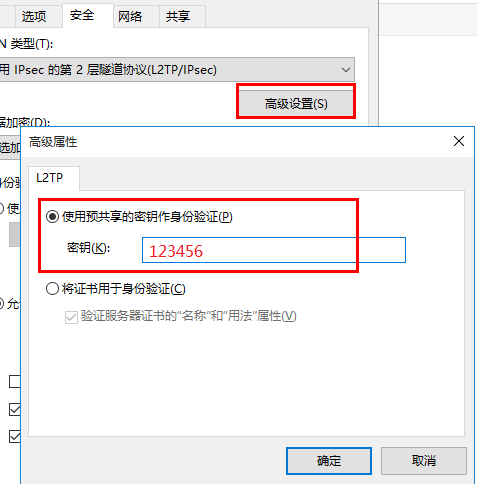 7、在L2TP模式下点击“高级设置”填写共享密钥“66666666"