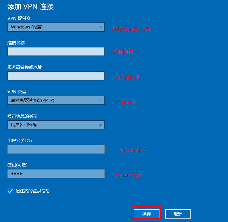 3、按照提示填写信息,其中服务器IP和VPN账号和密码填写自己购买的
