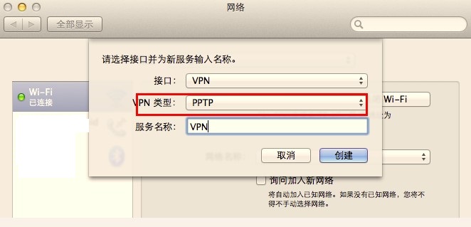 第四步: 在“接口”栏中选择“V-P-N”,在“V-P-N类型”栏中填入 “PPTP”,在“服务名称”中填入服务名称,然后点击“创建”