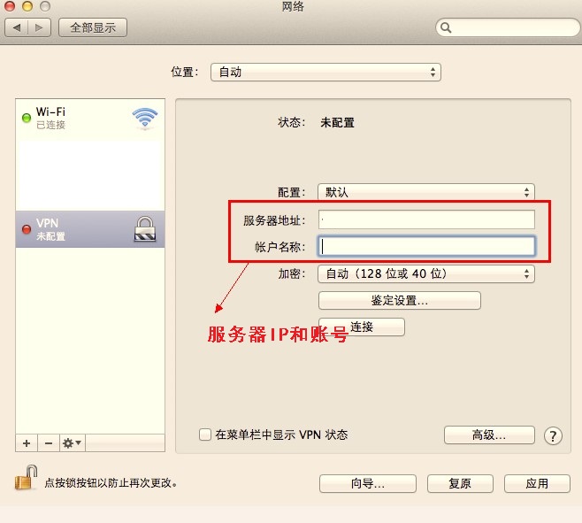 第五步:按照下面的示意图,在服务器栏中填入服务器IP,在账户栏中填入您购买的用户名,然后点击“鉴定设置”