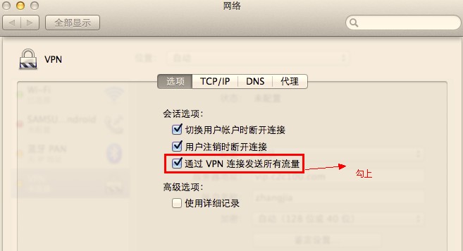 第七步:点击“高级”按钮,对使用方式进行设置,选中“使用V-P-N连接发送所有流量”,然后点击“确定”。