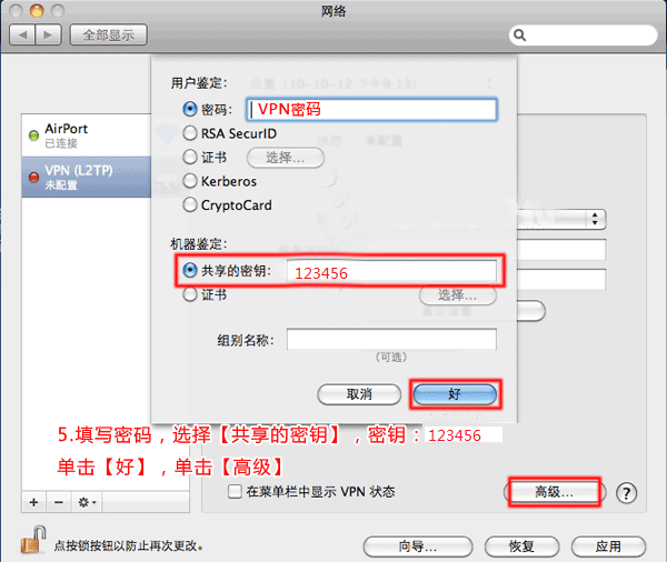 第五步:设置【密码】,机器鉴定选择【共享的密钥(密钥:66666666)】,设置好后单击【好】,然后单击【高级...】