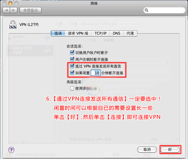 第六步:【通过VPN连接发送所有通信】一定要选中!闲置时间可以修改的长一些。单击【好】,然后单击【连接】即可连接VPN网络