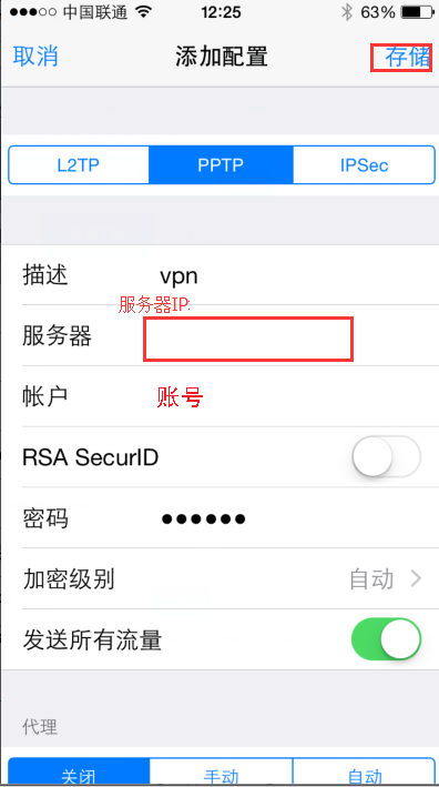 第四步:按照下面的示意图,在协议类型上选择“PPTP”,在“描述”栏中随便填入,在服务器栏中填入服务器IP,在账户和密码栏中填入您购买的用户名和密码,其他设置保持不变,然后点击“存储”。确认一下各项设置是否都跟下图一样,包括“加密级别”为“自动"底部的代理选择关闭