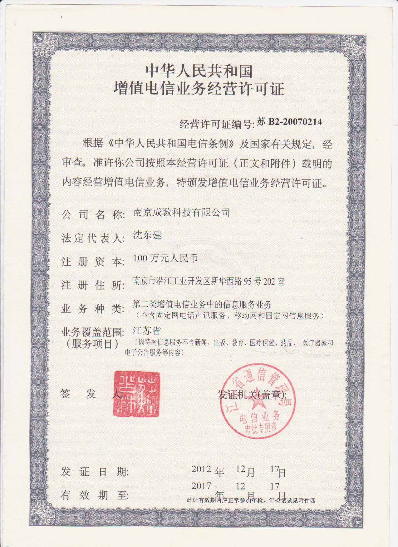《中华人民共和国增值电信业务经营许可证》编号: 苏B2-20070214号